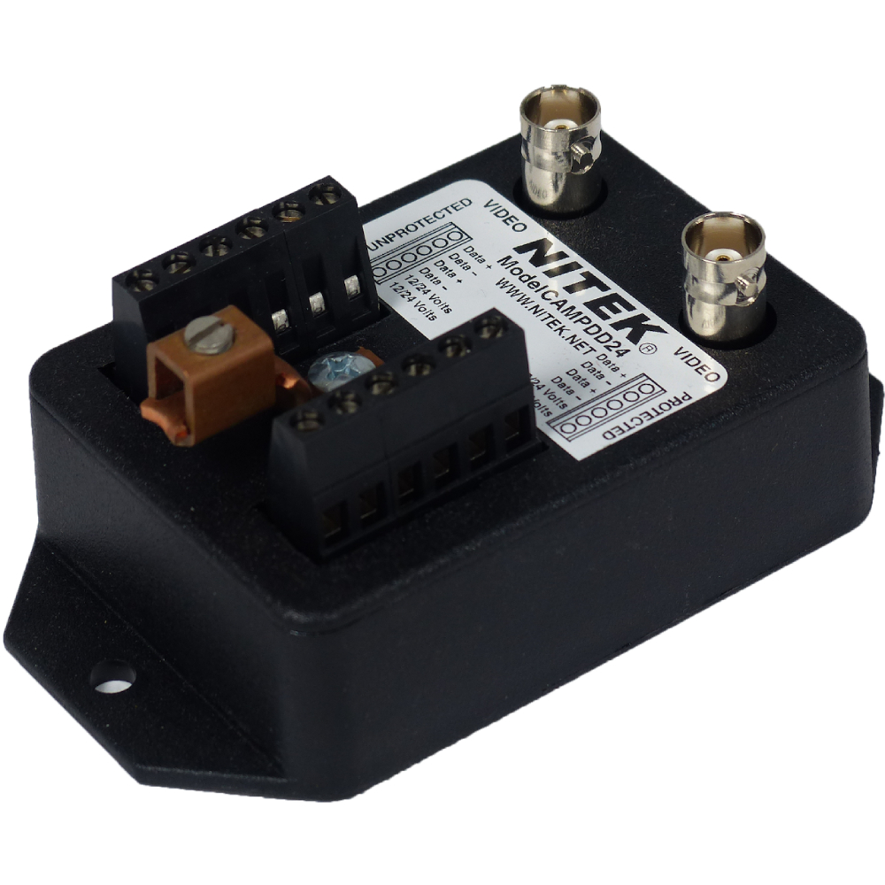 The unit has BNC connectors at the input and output for connection to the coax and screw terminals at the inputs and outputs for connection to the data and power. The CAMPDD24 provides a heavy, single-point ground connection and is easily installed in minutes.