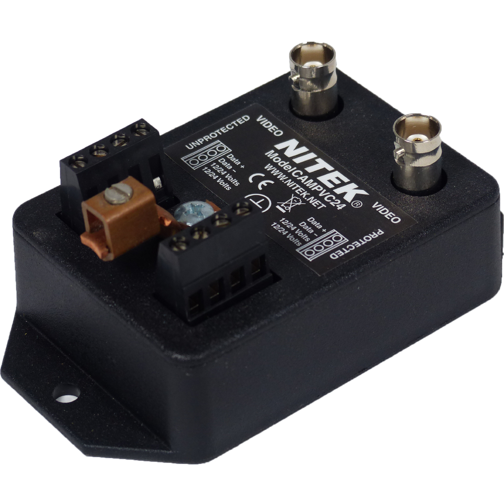 The CAMPVC24 is ideally suited for outdoor cameras. Where extreme protection on all signal connections is required. The unit has BNC connectors at the input and output for the connection to the coax and screw terminals at the inputs and outputs for connection to the data and power. The CAMPVC24 provides a heavy, single-point ground connection and is easily installed in minutes.