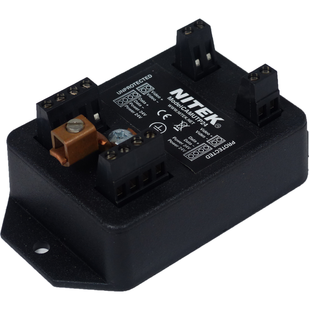 The CAMUTP24 is a single channel, multi-function surge protector for unshielded twisted pair video, twisted pair and data, and the 12 or 24-volt camera supply. The CAMUTP24 provides multi-stage surge protection to a single camera system and P/T/Z unit for each of these functions. The unit can be used at the camera or head-end. The CAMUTP24 is ideally suited for outdoor cameras, where extreme protection on all signal connections is required. The unit has screw terminals at the input and output for connection to the twisted pair video and screw terminals at the inputs and outputs for connection to the data and power. The CAMUTP24 provides a heavy, single, point ground connection and is easily installed in minutes.