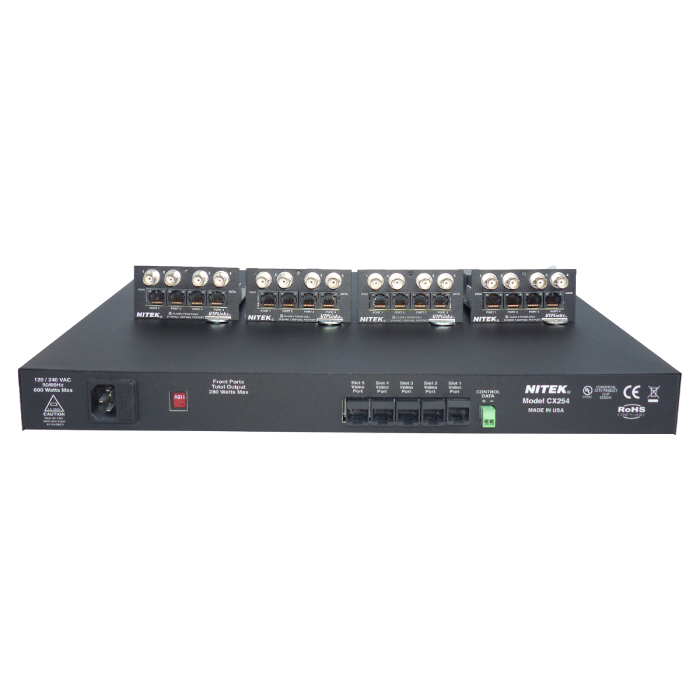 The CX254 combines a 10Amp 28VAC power supply with a 1 RU modular card cage designed to hold up five UTPLinks® modular crossover cards. The CX254 card cage supports any combination of the three modular card models that are available to meet the needs of your specific application. The CHM22 is a four-channel card that has four built-in video receivers, telemetry data, and power distribution. The CXM22 is also a four-channel card that offers telemetry data, power distribution but does not include the video receivers and allows for video pass through.