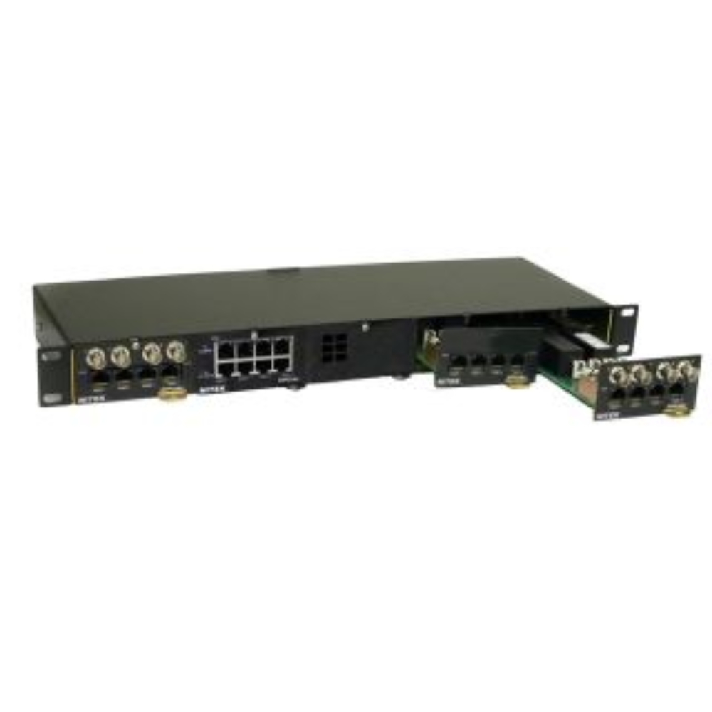 The CX452, configured with plug-in cards, is designed to work with TIA/EIA standards-based structured cabling networks. The crossover card cage provides five (5) RJ45 jacks at the rear of the unit for easy interfacing with either a copper backbone cable or Nitek video receiver equipment. Separate 24 VAC power inputs are provided for each card at the rear of the unit. The CX452 requires the use of a Nitek PS115 power supply.