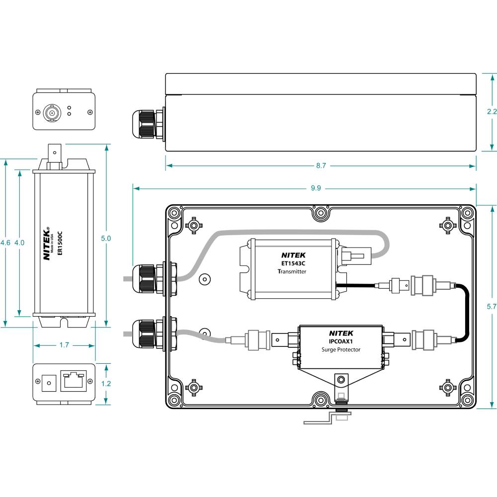 The EL1500CWS is part of the EtherStretch solution for outdoor applications. The EL1500CWS consists of an ET1543C mounted into a WP1325 weatherproof enclosure, an IPCOAX1 surge protector for the camera side (indicated by the “S” in the part number) and an ER1500C for the head end of the link. The EL1500CWS is the complete solution for camera surge, PoE power and 10/100 link extension up to 500m on RG-59 or RG-6 coaxial cabling. The ER1500C can source power to the link by requesting power from a PoE switch, or 30W of power can be injected from an optional PS48 power supply.