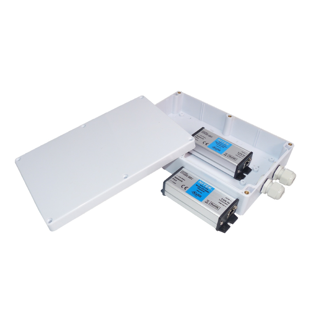 The EL1500UW is part of the EtherStretch solution for outdoor applications. The EL1500UW consists of an ET1500U mounted in a WP1325 enclosure for the camera side, and an ER1500U for the head end of the link. The EL1500UW is the complete solution for PoE power and 10/100 link extension over up to 600m of Cat5e (or better) cabling. The ER1500U sources power to the link by requesting power from a PoE switch, or up to 30W power can be injected from an optional PS48 power supply.