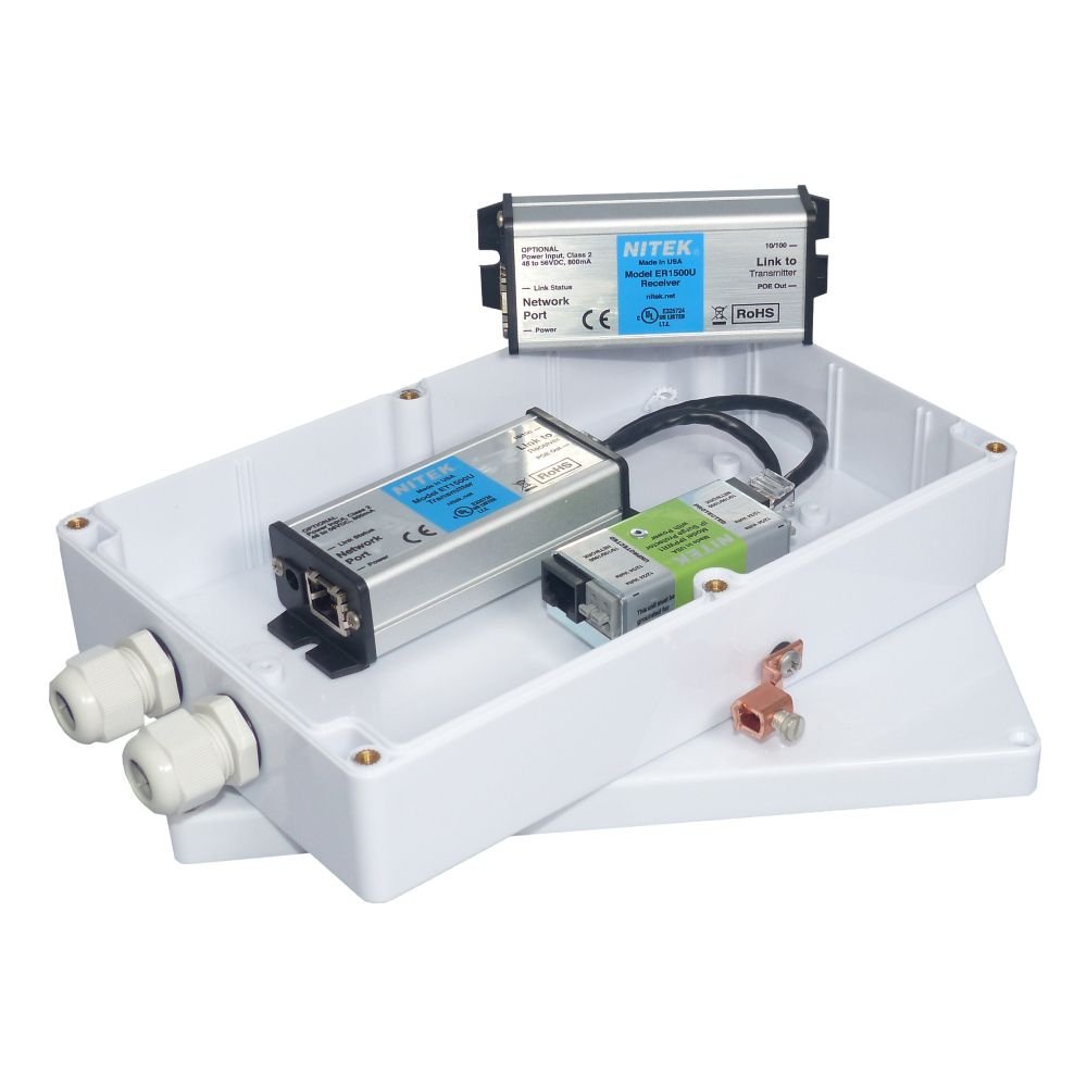 Outdoor IP over UTP. Set includes: ET1500U Transmitter, ER1500U Receiver, Weatherproof Case, and Surge Protector.