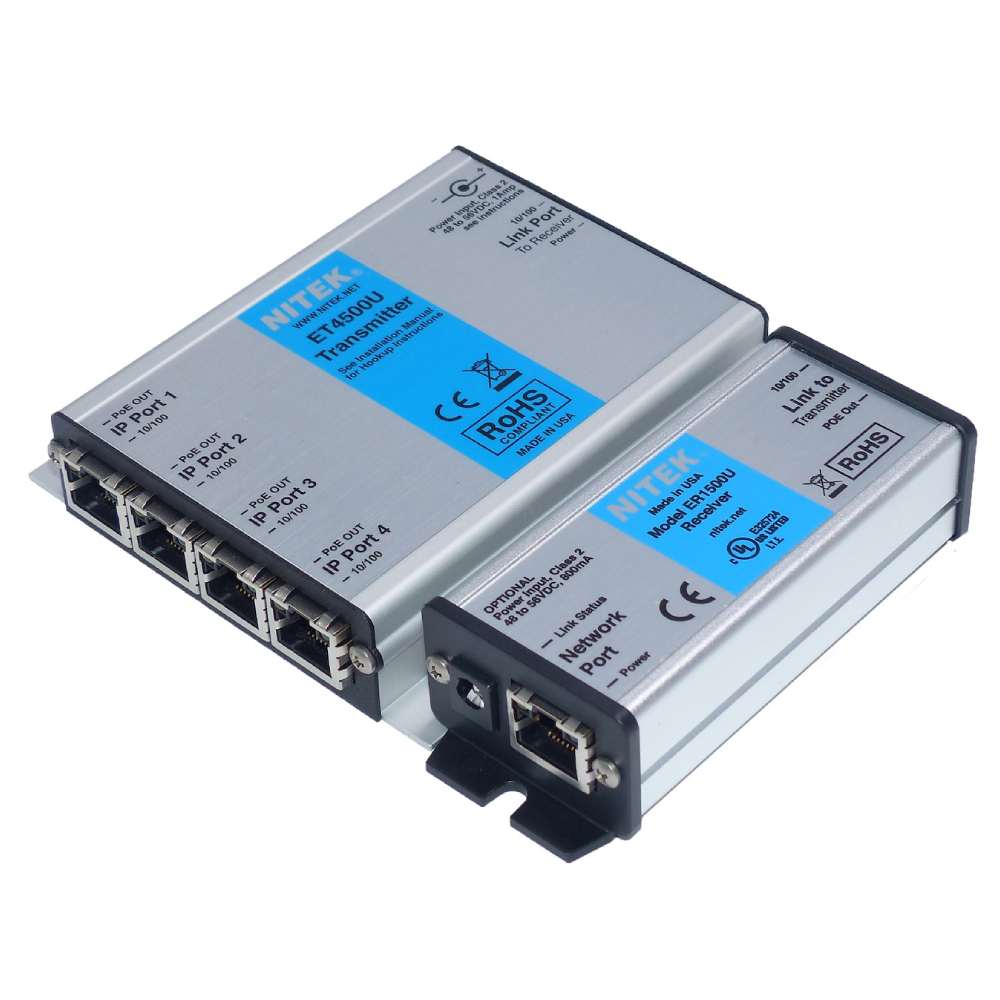 The EL4500U is a complete link consisting of a 4-port transmitter, a transmitter power supply, and a receiver unit. The receiver will negotiate with a PoE switch at the head end to power the link, or power can be injected at the head end using another optional PS48. The EL4500U is transparent to the network are requires no MAC addressing.LED indicators show the status of network communication and PoE power. Both transmitter and receiver are housed in industrial-grade anodized aluminum housings with mounting ears.