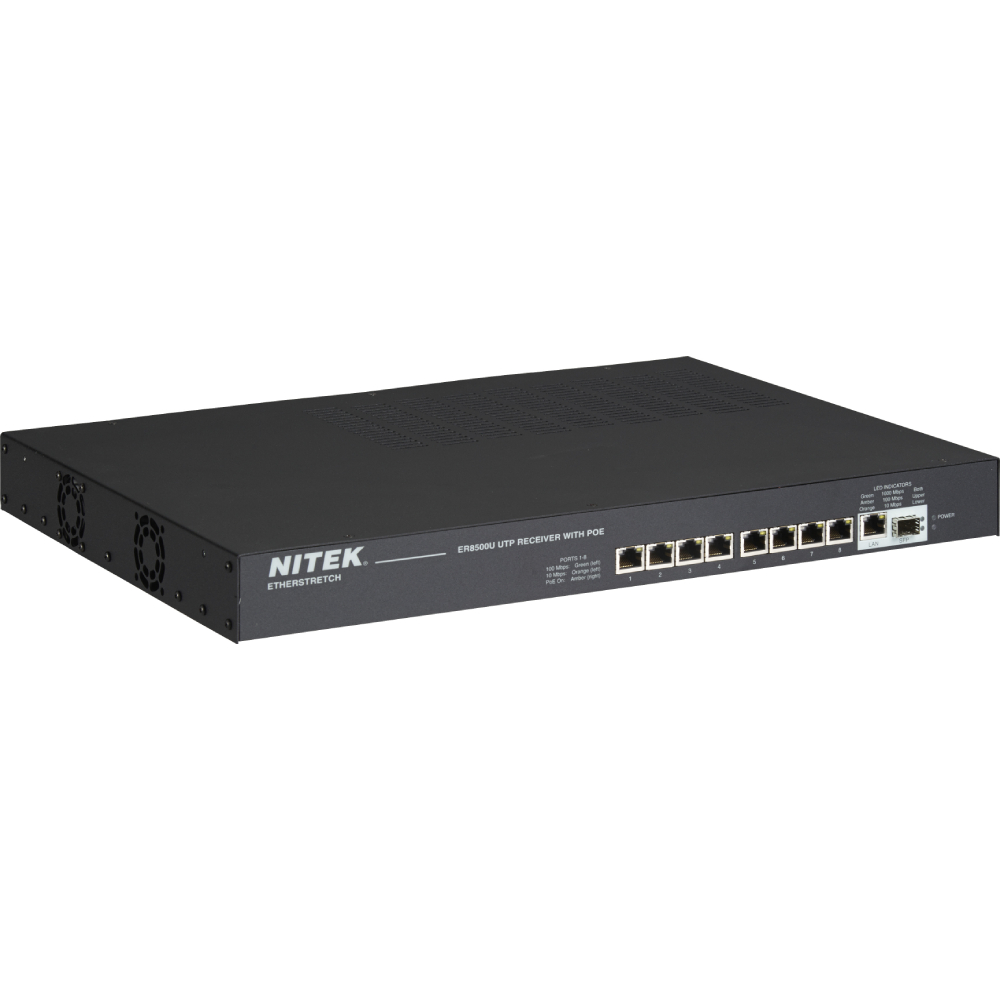 The ER8500U is another component of NITEK’s exciting EtherStretch solution, allowing for the use of standard Cat5 UTP (or better) cabling to provide power and 10/100 connectivity well past the limits of standard Ethernet. The ER8500U is a head-end receiver that will power and communicate to up to 8 remote devices over UTP runs. The ER8500U incorporates an integrated power supply to power each run and a built-in Ethernet switch with Gigabit LAN connectivity. The ER8500U can be controlled and monitored over a built-in web server. The ER8500U can maintain 10/100 Ethernet links over standard UTP cabling up to 600m.