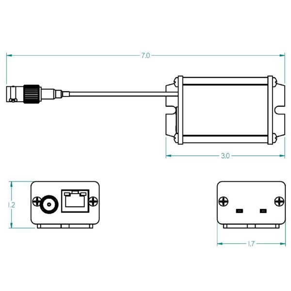 The ET1543C is housed in a mini industrial-grade anodized aluminum housing with mounting ears. The mini enclosure and flexible BNC cable allow for installation into tight spaces. The ET1543C has LEDs for link status and PoE activity.