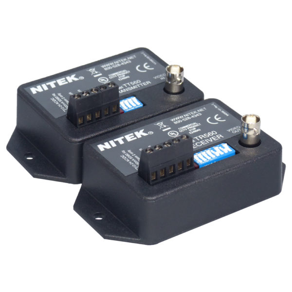 The EX560 is a complete twisted pair video system made up of a TR560 receiver unit and a TT560 transmitter unit. The system is designed to operate over category 2 or better twisted pair cable. It works well over existing communication, computer network spare pairs, or new cable installations. A highly balanced transmitter output assures that the system will not interfere with other network equipment. Advanced receiver and transmitter electronics provide optimum video quality and complete immunity from the ground loop, hum, and noise. Both the transmitter and receiver provide adjustment for gain and frequency compensation allowing the system to be “fine-tuned” for the cable these unique adjustments provide optimum performance over the entire operating range of the system and allow cable lengths to be estimated with a wide safety margin. The receiver and transmitter units each require 12-24 VAC/VDC power. In multiple receivers and /or transmitter applications a common supply can be used for the system.